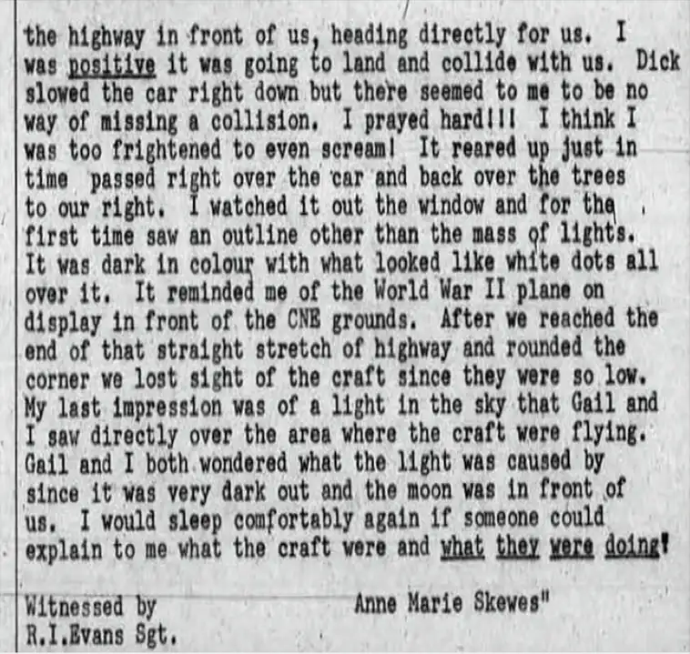 לאחר שהגיעו לביתם הם דיווחו על האירוע למשטרת קנדה. סמל אוונס שחקר כ"א מהעדים בנפרד, מצא שהעדות שלהם רצינית ואינטליגנטית, מלווה בפחד העמוק שחוו.