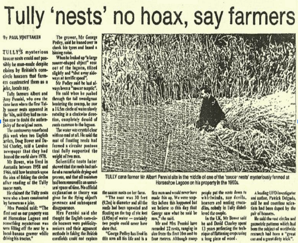 בשעות הבוקר המוקדמות של ה־19 בינואר 1966 אירע אחד המקרים המסקרנים והמוכרים בתולדות חקר העב"מים באוסטרליה — אירוע שזכה מאז לכינוי “קיני העב"מים של טאלי” (UFO Nests). העד המרכזי בפרשה היה ג'ורג' פדלי, איכר בן 28, שעבד באותו בוקר עם הטרקטור שלו בסמוך ללגונת “פרסת הסוס” ליד העיירה טאלי, בצפון־מזרח קווינסלנד, לא הרחק מחופי האוקיאנוס […]